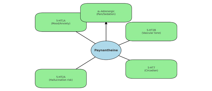 Paynantheine has been reported to interact with α₂-adrenergic receptors, which are known to modulate pain perception, sedation, and autonomic tone (Frontiers in Pharmacology – Kratom Pharmacology).
