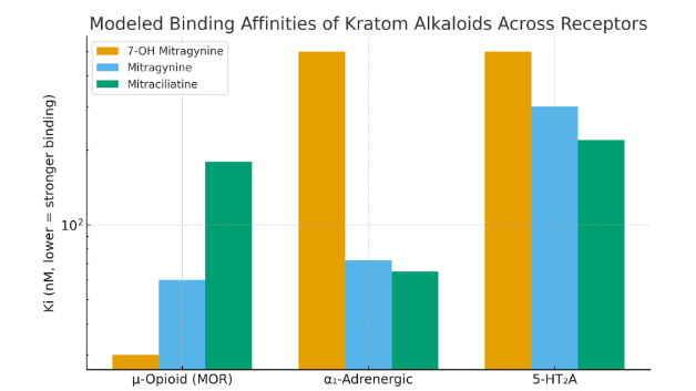 Mitraciliatine (PubChem CID 11741588) is a diastereomer of mitragynine found in Mitragyna speciosa leaves at < 0.2 % w/w (Sharma et al., 2019). The configuration at C-3 and C-20 (3R, 20R) alters receptor-binding geometry within opioid and adrenergic families. This section summarizes verified receptor-interaction data from in silico docking, in vitro functional assays, and cross-species pharmacokinetic studies.